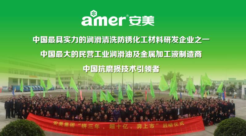 安美科技股份有限公司始创于1995年,二十多年来一直专注于CNC、模具、压铸、注塑、重工机械、汽车零部件、机加工等60多个行业的设备润滑的研究与生产。安美集团以“遵道爱人,厚德润物”为经营理念,凭借多年的工业耗材领域润滑专家经验,提供金属切/削/磨各工序加工、环保清洗、防锈、零排放的实战解决方案,主要产品包括工业润滑油、金属加工液、清洗剂、防锈剂、车用油、导热节能产品等,是国家级高新科技企业、广东著名商标、中国最受欢迎工业润滑油品牌、中国民营润滑油企业十强、AAA级信用企业。